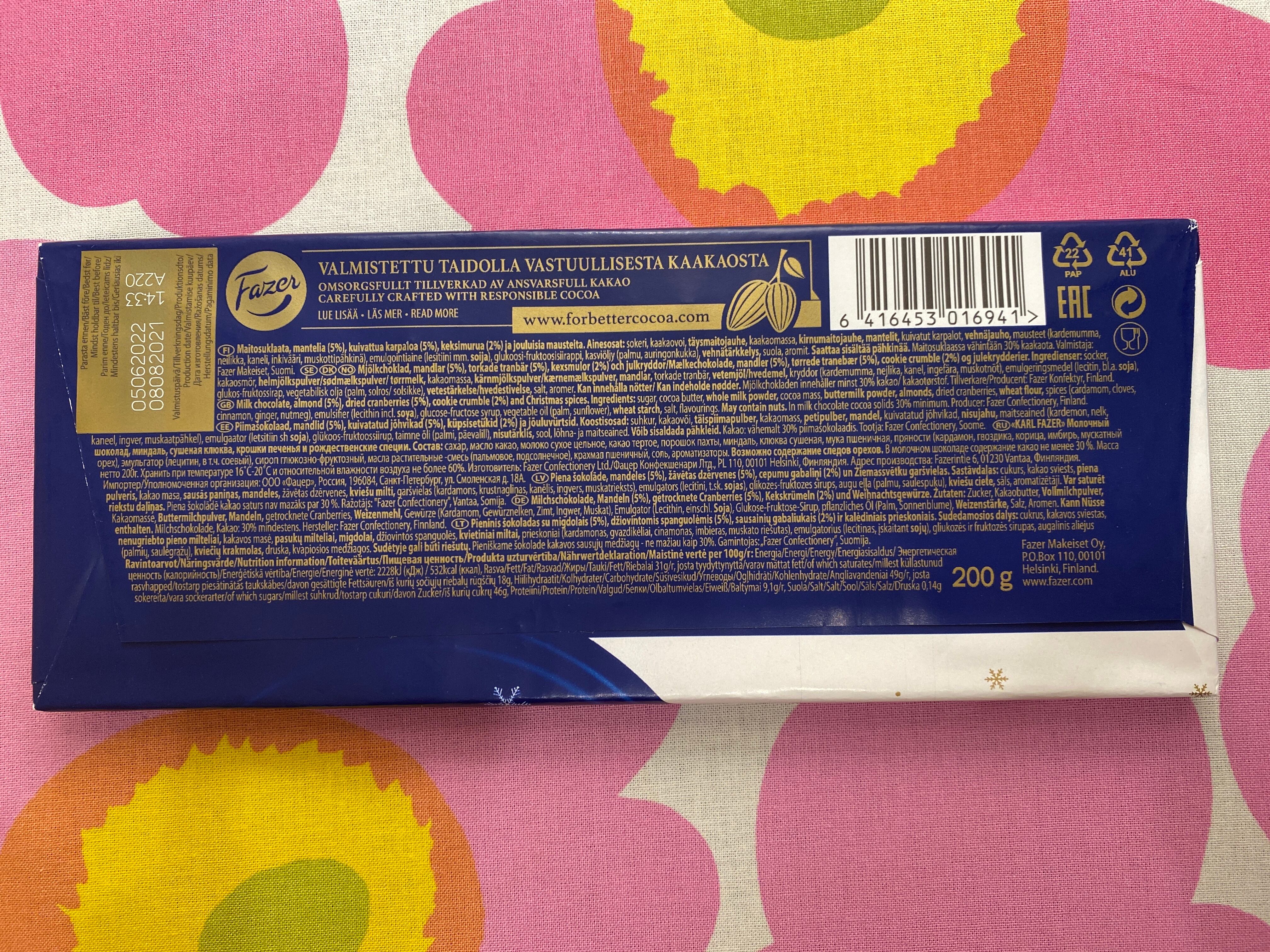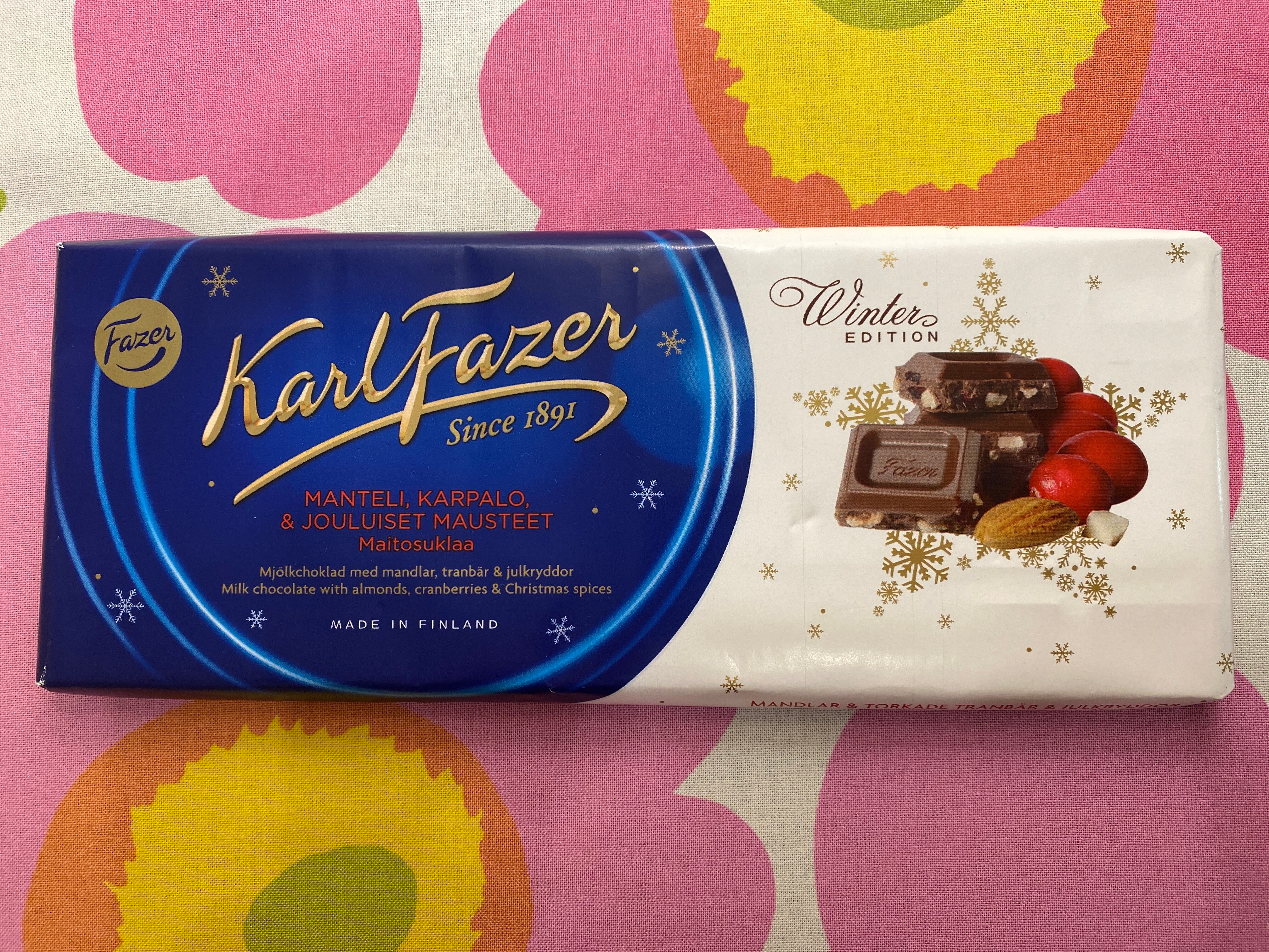 フィンランドで有名な【Fazer】の冬限定チョコレートです。この時期になると出回る限定品です。