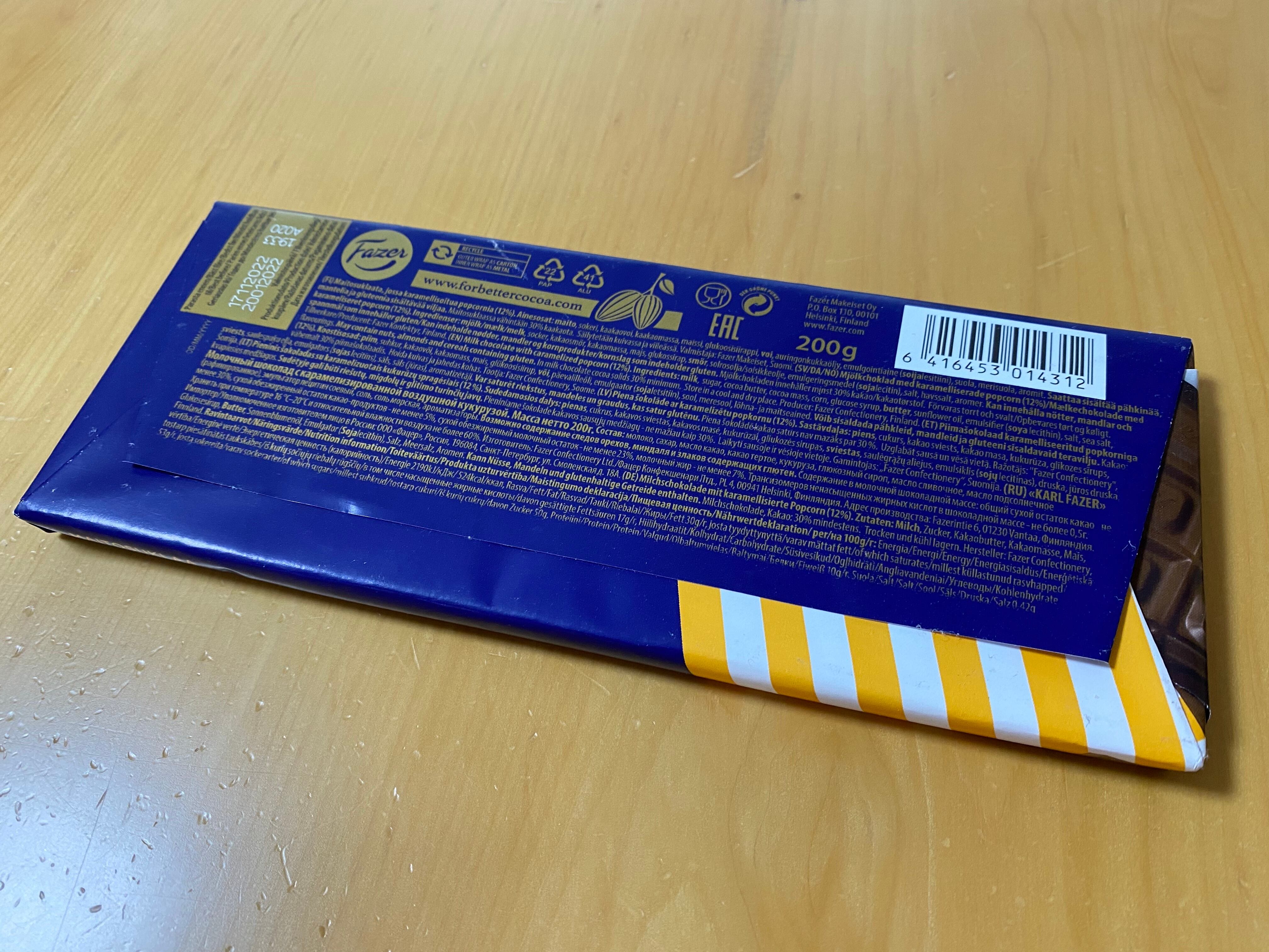ミルクチョコレートwith キャラメルポップコーン【Milk chocolate with caramelized popcorn】(Fazer)200g
